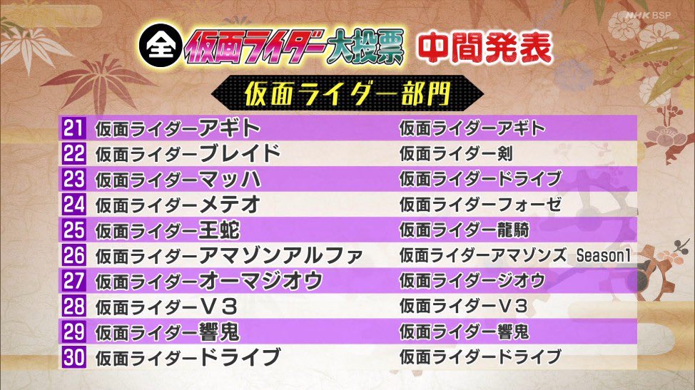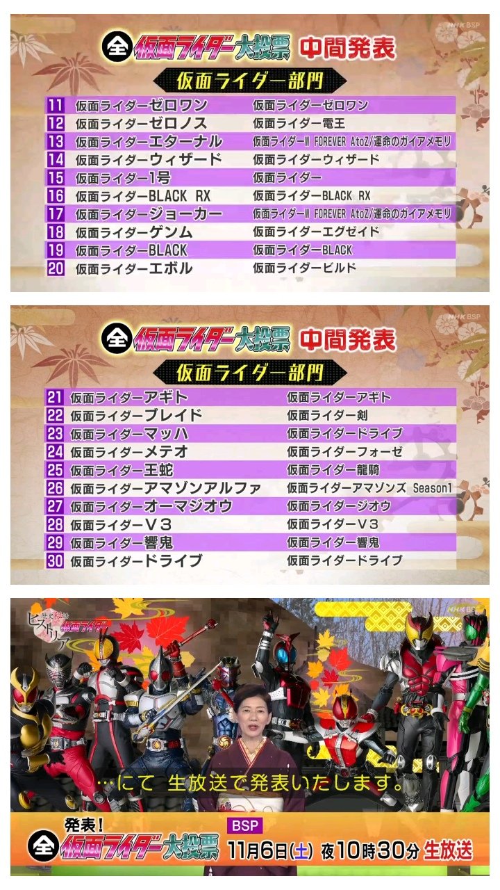 わび さび On Twitter 全仮面ライダー大投票 中間発表 11 30位 仮面ライダー部門 最終結果 11月6日 土曜 22 30 生放送 歴史秘話ヒストリア 仮面ライダーヒストリア Https T Co Qsk6wjrs99 Twitter